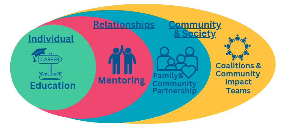 This holistic approach is rooted in the social-ecological model of health, a proven framework that emphasizes addressing multiple layers of influence — individual, relational, community, and societal — to build strengths, prevent challenges, and improve overall well-being.